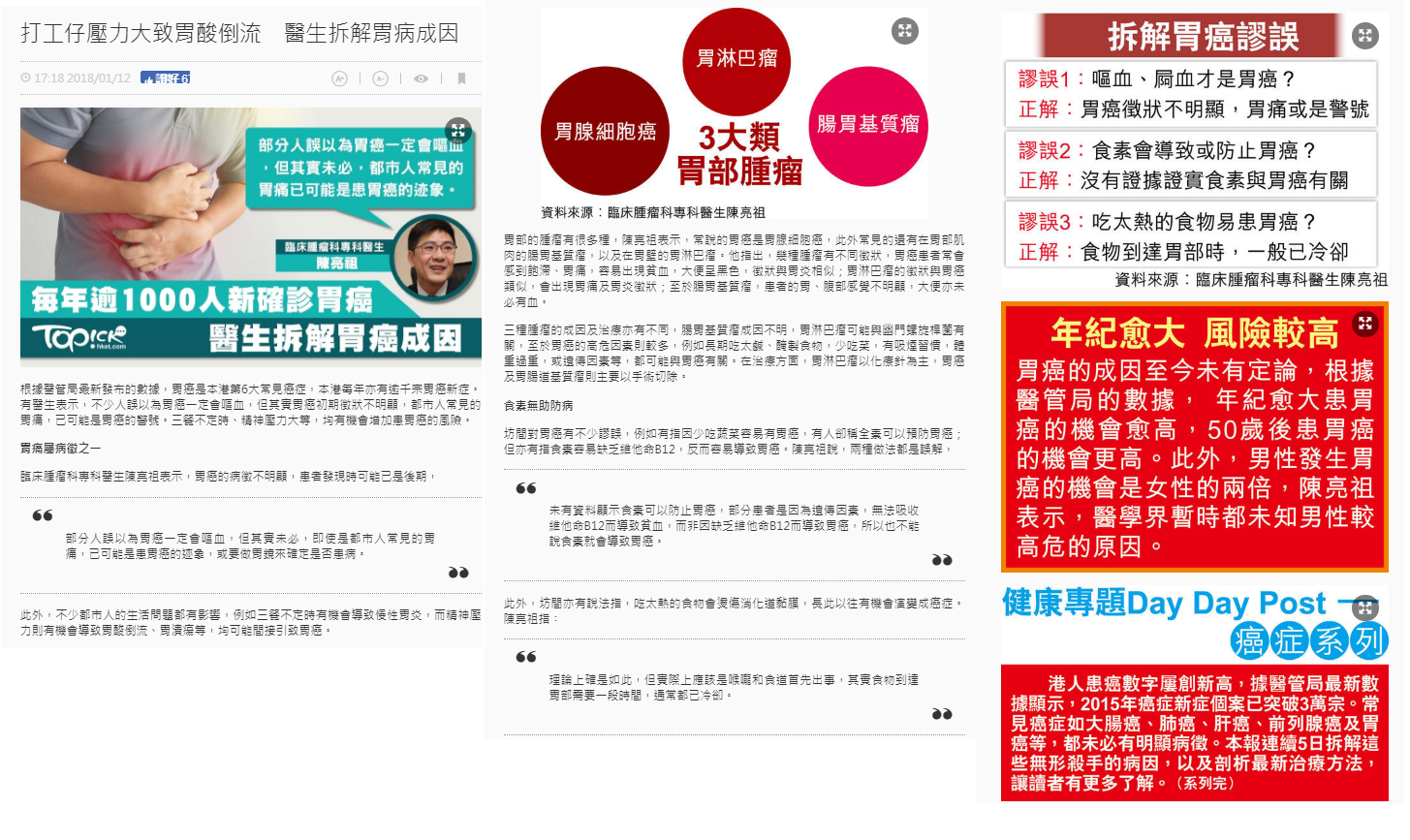 臨床腫瘤科專科醫生陳亮祖表示,胃癌的病徵不明顯,患者發現時可能已是後期,
