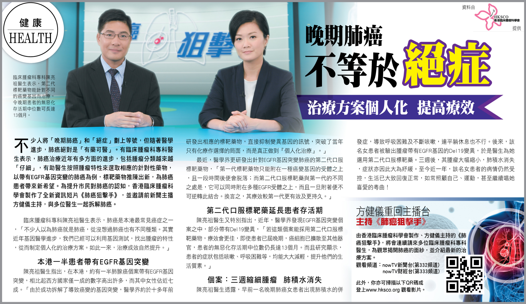 不少人將「晚期肺癌」和「絕症」劃上等號 ,但隨着醫學進步,肺癌絕對是「有藥可醫」。有臨床腫瘤科專科醫生表示,肺癌治療近年有多方面的進步,包括腫瘤分類越來越「仔細」,有助醫生按照腫瘤特性來選取相應的針對性藥物,以帶有EGFR基因突變的肺癌為例,標靶藥物推陳出新,為肺癌患者帶來新希望。為提升市民對肺癌的認知,香港臨床腫瘤科學會製作了全新資訊短片<<肺癌狙擊手>>,並邀請前新聞主播方健儀主持,與多位醫生一起拆解肺癌。