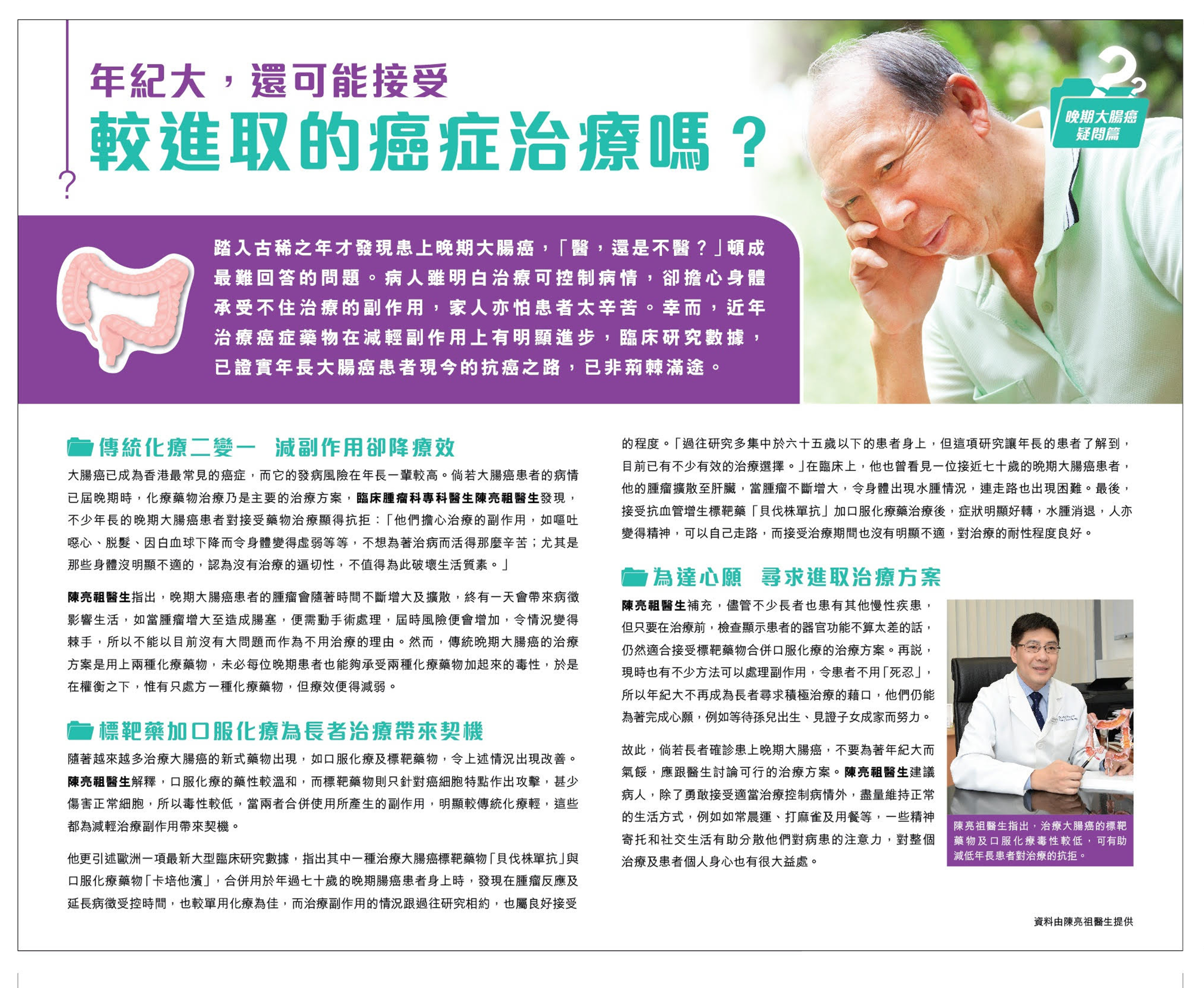 他更引述歐洲一項最新大型臨床研究數據,指出其中一種治療大腸癌標靶藥物「貝伐株單抗」與口服化療藥物「卡培他濱」,合併用於年過七十歲的晚期腸癌患者身上時,發現在腫瘤反應及延長病徵受控時間,也較單用化療為佳,而治療副作用的情況跟過往研究相約,也屬良好接受的程度。「過往研究多集中於六十五歲以下的患者身上,但這項研究讓年長的患者了解到,目前已有不少有效的治療選擇。」在臨床上,他也曾看見一位接近七十歲的晚期大腸癌患者,他的腫瘤擴散至肝臟,當腫瘤不斷增大,令身體出現水腫情況,連走路也出現困難。最後,接受抗血管增生標靶藥「貝伐株單抗,」加口服化療藥治療後,症狀明顯好轉,水腫消退,人亦變得精神,可以自己走路,而接受治療期間也沒有明顯不適,對治療的耐性程度良好。