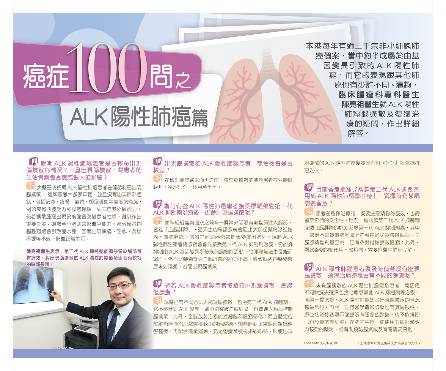本港每年有逾三千宗非小細胞肺癌個案,當中約半成屬於由基因變異引致的ALK陽性肺癌,而它的表現跟其他肺癌也有少許不同。這趟,臨床腫瘤科專科醫生陳亮祖醫生就ALK陽性肺癌腦擴散及復發治療的疑問,作出詳細解答。
