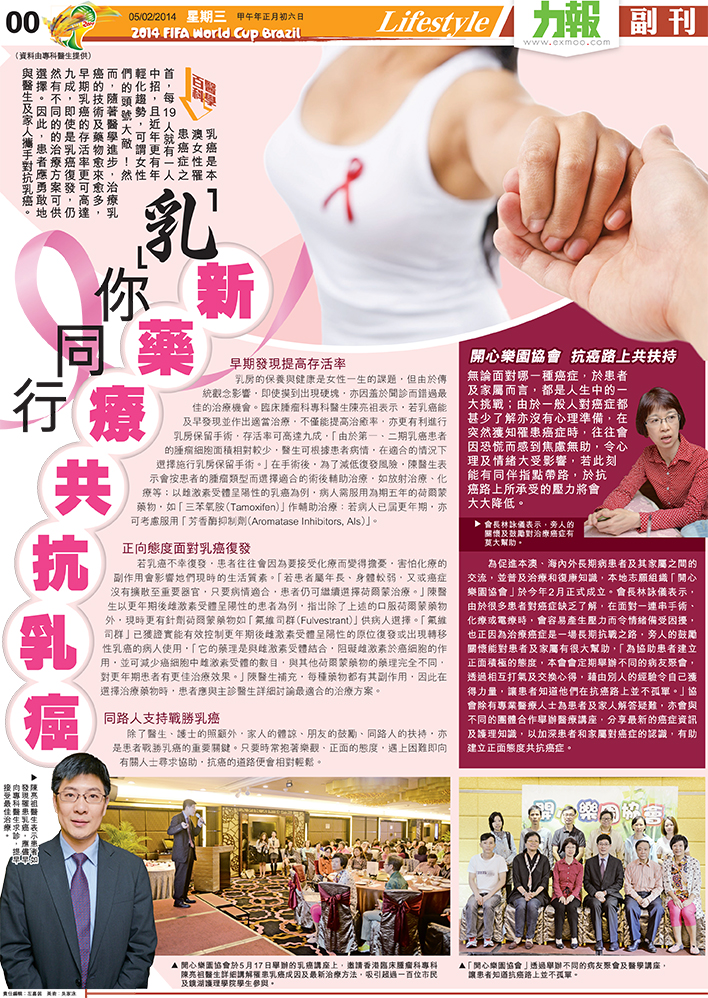 除了醫生、護士的照顧外,家人的體諒、朋友的鼓勵、同路人的扶持,亦是患者戰勝乳癌的重要關鍵。只要時常抱著樂觀、正面的態度,遇上困難即向有關人士尋求協助,抗癌的道路便會相對輕鬆。