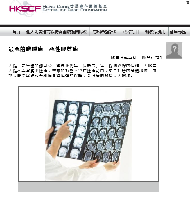 腦腫瘤,顧名思義就是生長在腦內的腫瘤,而根據腫瘤不同的生長速度、生長方式、形態、分化程度等,可劃分為高、中、低的惡性級別,其中以惡性膠質瘤(Glioblastoma Multiforme, GBM)的惡性程度最高。根據醫院管理局香港癌症資料統計中心的數位,本港每年約有200 宗惡性腦腫瘤新症,當中一半為惡性膠質瘤。然而臨床腫瘤科專科陳亮祖醫生指出,當腫瘤生長在腦內,不論性質是良是惡,皆視為嚴重,不容忽視。「因為頭顱骨很堅固,腫瘤一旦在腦內形成,便沒有空間生長,必定會壓迫正常腦部,引起身體機能的問題。所以任何生長在腦內的腫瘤,即使是良性或生長緩慢,亦會當作惡性處理。」