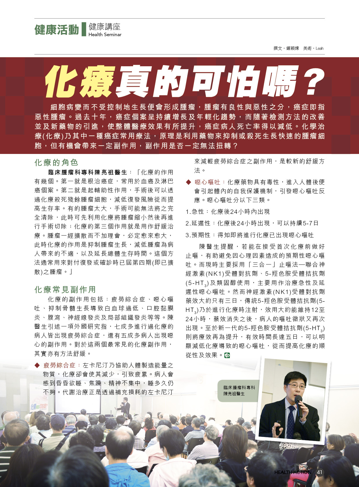 化療的副作用包括:疲勞綜合症、噁心嘔吐、抑制骨髓生長導致白血球過低、口腔黏膜炎、腹瀉、神經線發炎及局部組織發炎等等。陳醫生引述一項外國研究指,七成多進行過化療的病人皆出現疲勞綜合症,還有五成多病人出現噁心的副作用。對於這兩個最常見的化療副作用,其實亦有方法舒緩。