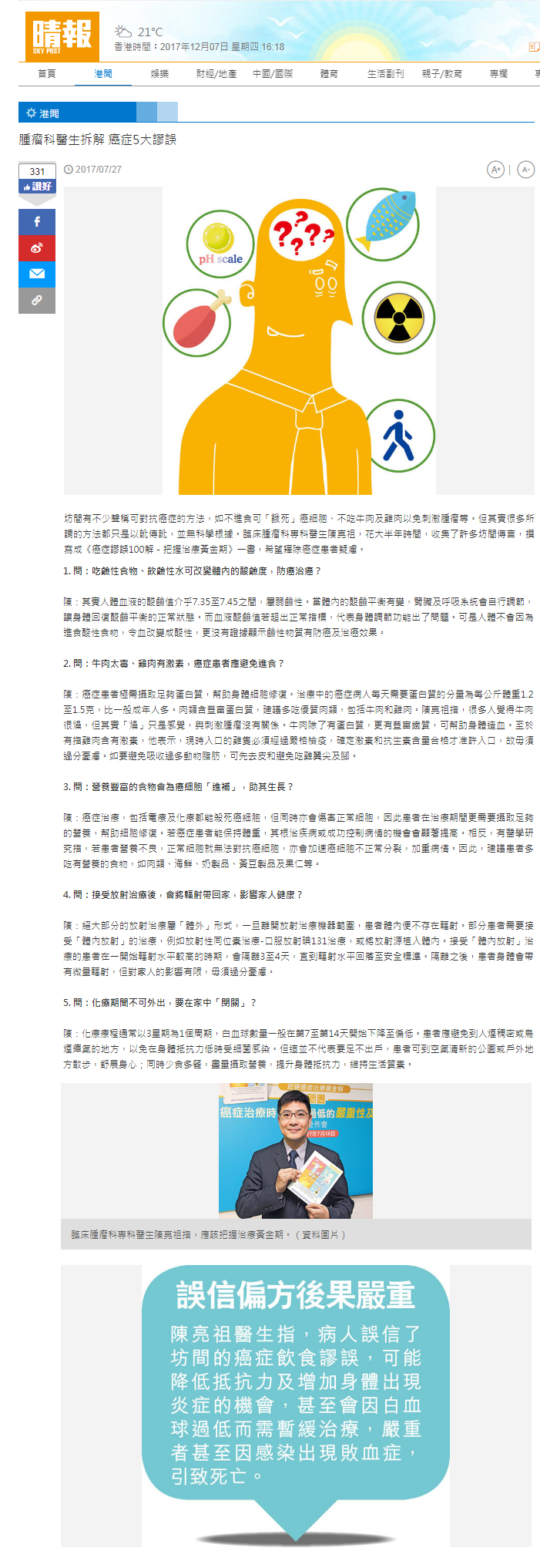 坊間有不少聲稱可對抗癌症的方法,如不進食可「餓死」癌細胞、不吃牛肉及雞肉以免刺激腫瘤等。但其實很多所謂的方法都只是以訛傳訛,並無科學根據。臨床腫瘤科專科醫生陳亮祖,花大半年時間,收集了許多坊間傳言,撰寫成《癌症謬誤100解-把握治療黃金期》一書,希望釋除癌症患者疑慮。