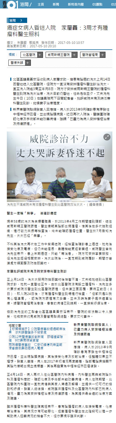 北區區議員黃宏滔收到病人家屬求助,指患有腦癌的冼太上月14日因昏迷送入北區醫院,但院方一直沒有安排腫瘤科醫生診治冼太。直至冼入院逾3周至本月8日,院方才安排威爾斯親王醫院的腫瘤科醫生到院為冼太治療,冼太目前仍昏迷,性命危在旦夕。丈夫冼先生今日(10日)在議員陪同下召開記者會,批評威院未有及時派專科醫生到診,拖慢妻子治療進度。