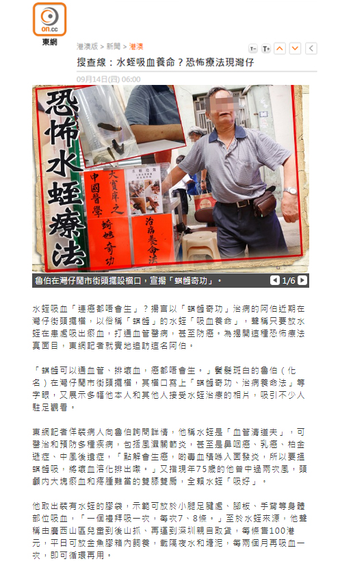 水蛭吸血「連癌都唔會生」?揚言以「蜞乸奇功」治病的阿伯近期在灣仔街頭擺檔,以俗稱「蜞乸」的水蛭「吸血養命」,聲稱只要放水蛭在患處吸出瘀血,打通血管醫病,甚至防癌。為揭開這種恐怖療法真面目,東網記者就實地追訪這名阿伯。