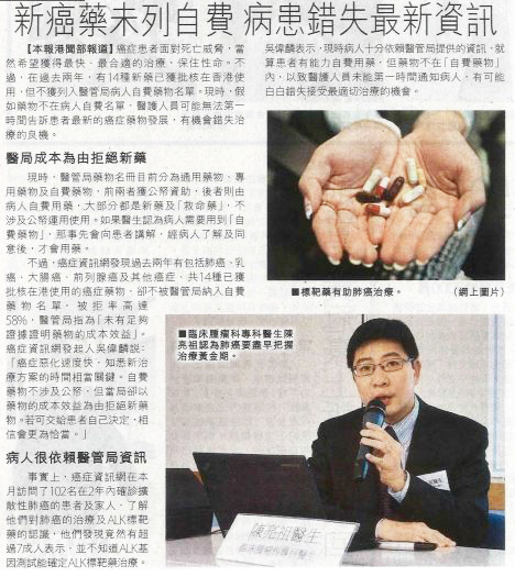 事實上,癌症資訊網在本月訪問了102名在2年內確診擴散性肺癌的患者及家人,了解他們對肺癌的治療及ALK標靶藥的認識,他們發現竟然有超過7成人表示,並不知道ALK基因測試能確定ALK標靶藥治療。吳偉麟表示,現時病人十分依賴醫管局提供的資訊,就算患者有能力自費用藥,但藥物不在「自費藥物」內,以致醫護人員未能第一時間通知病人,有可能白白錯失接受最適切治療的機會。