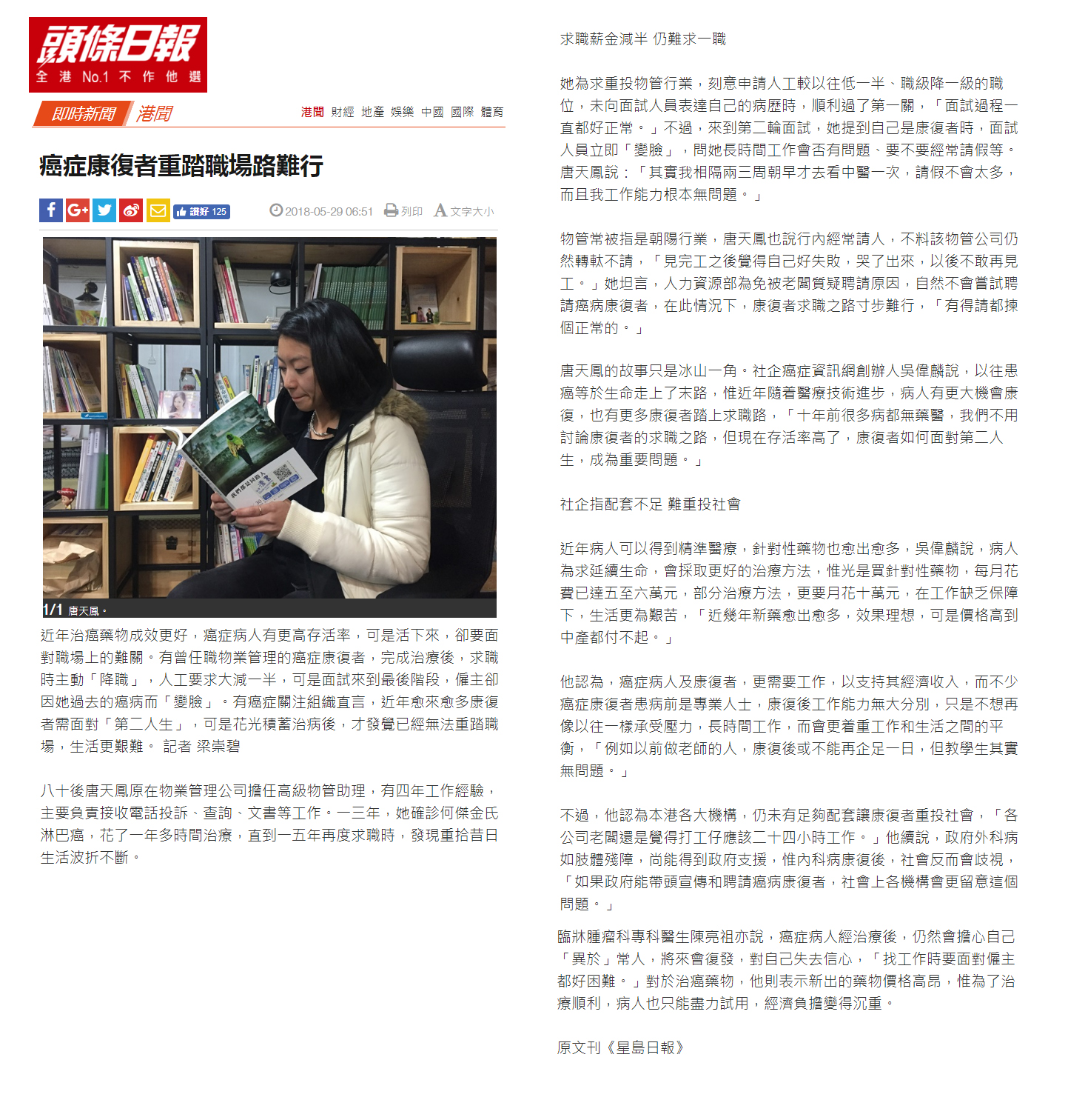 唐天鳳的故事只是冰山一角。社企癌症資訊網創辦人吳偉麟說,以往患癌等於生命走上了末路,惟近年隨着醫療技術進步,病人有更大機會康復,也有更多康復者踏上求職路,「十年前很多病都無藥醫,我們不用討論康復者的求職之路,但現在存活率高了,康復者如何面對第二人生,成為重要問題。」