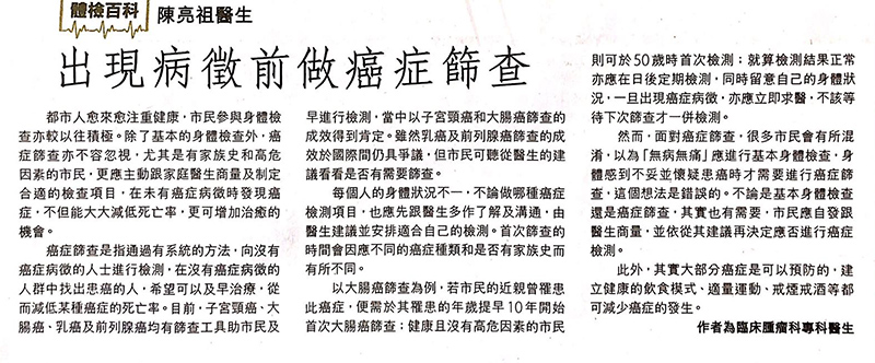都市人愈來愈注重健康,市民參與身體檢查亦較以往積極。除了基本的身體檢查外,癌症篩查亦不容忽視,尤其是有家族史和高危因素的市民,更應主動跟家庭醫生商量及制定合適的檢查項目,在未有癌症病徵時發現癌症,不但能大大減低死亡率,更可增加治癒的機會。