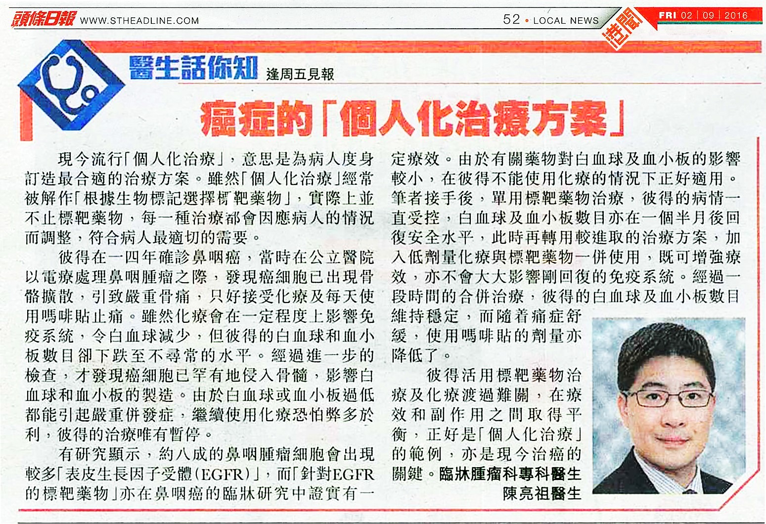 彼得活用標靶藥物治療及化療渡過難關,在療效和副作用之間取得平衡,正好是「個人化治療」的範例,亦是現今治癌的關鍵。
