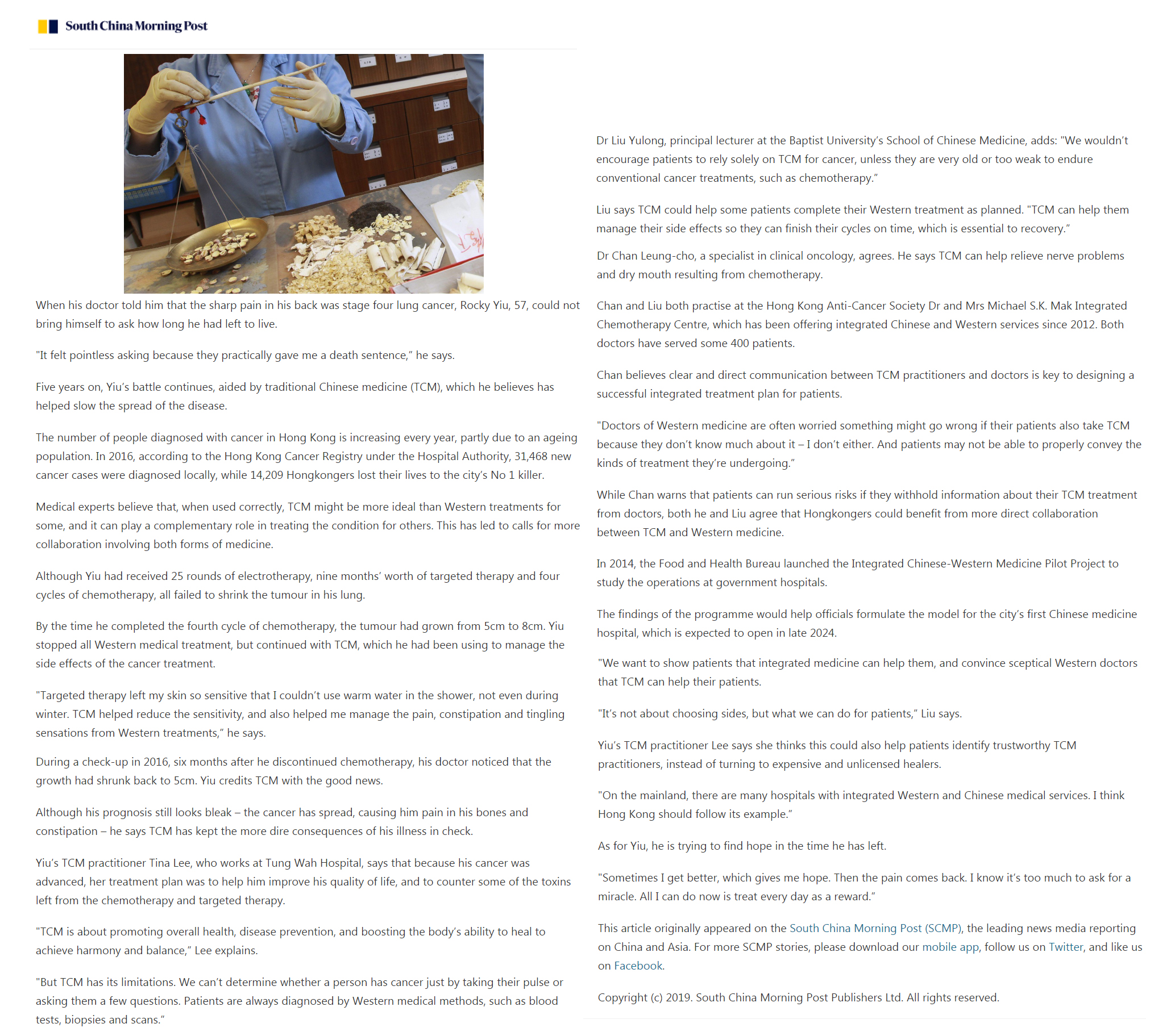 While Chan warns that patients can run serious risks if they withhold information about their TCM treatment from doctors, both he and Liu agree that Hongkongers could benefit from more direct collaboration between TCM and Western medicine.