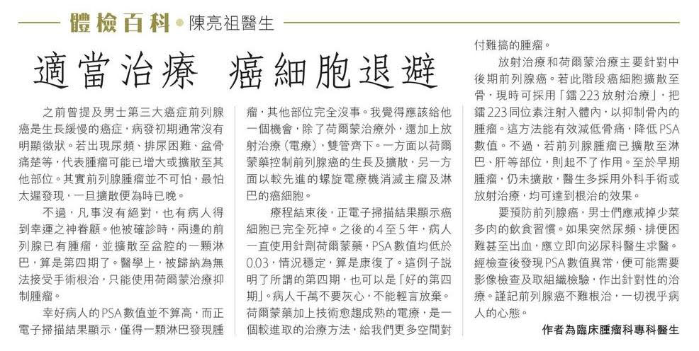 療程結束後,正電子掃描結果顯示癌細胞已完全死掉。之後的四至五年,病人一直使用針劑荷爾蒙藥,PSA數值均低於0.03,情況穩定,算是康復了。這例子說明了所謂的第四期,也可以是「好的第四期」。病人千萬不要灰心,不能輕言放棄。荷爾蒙藥加上技術愈趨成熟的電療,是一個較進取的治療方法,給我們更多空間對付難搞的腫瘤。