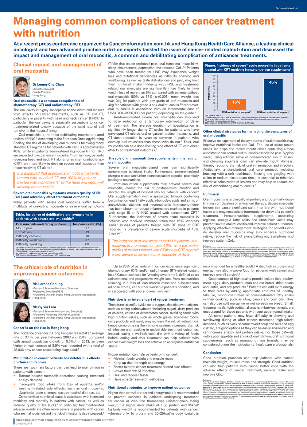 At a recent press conference organized by Cancerinformation.com.hk and Hong Kong Health Care Alliance, a leading clinical oncologist and two advanced practice nutrition experts tackled the issue of cancer-related malnutrition and discussed the impact and management of oral mucositis, a common and debilitating complication of anticancer treatments.