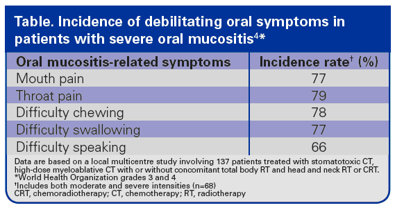 Many patients with severe oral mucositis suffer from a multitude of coexisting moderate or severe oral symptoms (Table) that cause profound pain, oral functional incapability, sleep disturbances, depression and reduced QoL. Patients who have been treated for HNC may experience weight loss and nutritional deficiencies as difficulty chewing and swallowing, as well as taste disturbances and pain, may limit their nutritional intake. Patients with HNC and treatment-related oral mucositis are significantly more likely to have weight loss of more than 5% compared with patients without oral mucositis (60% vs 17%; p<0.001); mean weight loss was 3kg for patients with any grade of oral mucositis and 4kg for patients with 3 or 4 oral mucositis and 4kg for patients with grade 3 or 4 oral mucositis. Moreover, oral mucositis is associated with an incremental cost of US$1,700-US$6,000 per patients, depending on the grade.