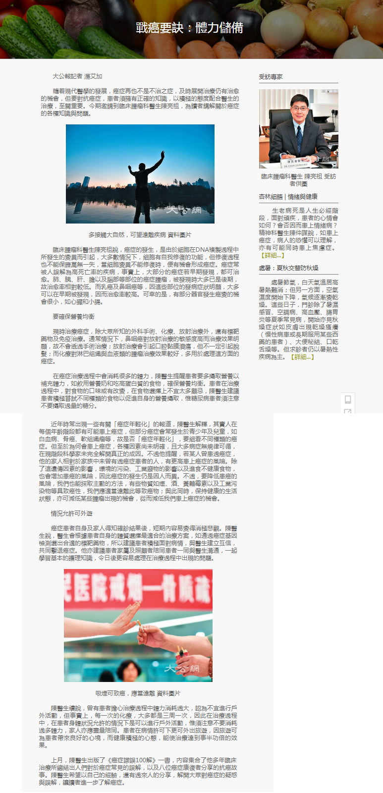 上月,陳醫生出版了《癌症謬誤100解》一書,內容集合了他多年臨床治療所總結出人們對於癌症常見的誤解,以及八位癌症康復者分享的抗癌故事。陳醫生希望以自己的經驗,還有過來人的分享,解開大眾對癌症的疑惑與誤解,讓讀者進一步了解癌症。