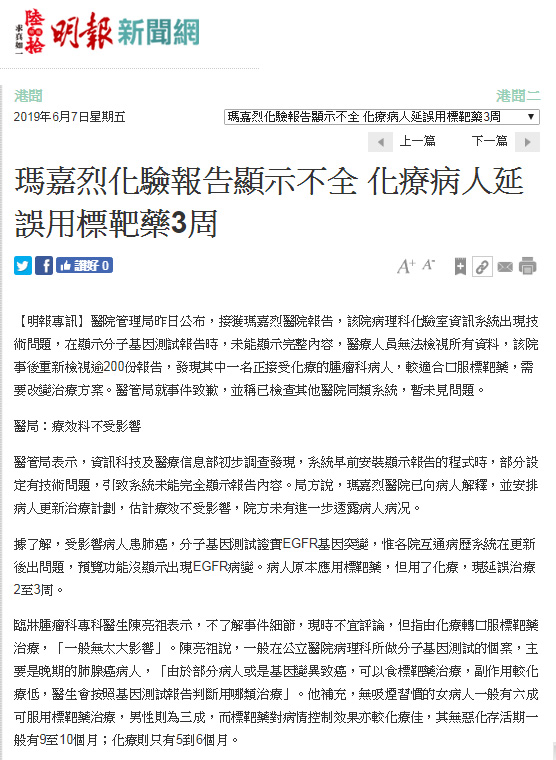據了解,受影響病人患肺癌,分子基因測試證實EGFR基因突變,惟各院互通病歷系統在更新後出問題,預覽功能沒顯示出現EGFR病變。病人原本應用標靶藥,但用了化療,現延誤治療2至3周。