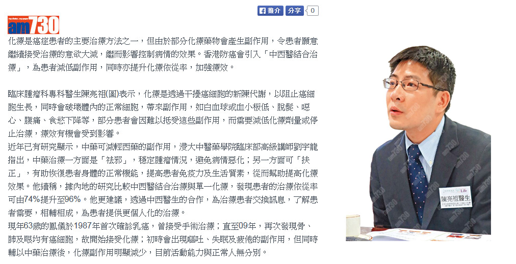 近年已有研究顯示,中藥可減輕西藥的副作用,浸大中醫藥學院臨床部高級講師劉宇龍指出,中藥治療一方面是「祛邪」,穩定腫瘤情況,避免病情惡化;另一方面可「扶正」,有助恢復患者身體的正常機能,提高患者免疫力及生活質素,從而幫助提高化療效果。他續稱,據內地的研究比較中西醫結合治療與單一化療,發現患者的治療依從率可由74%提升至96%。他更建議,透過中西醫生的合作,為治療患者交換訊息,了解患者需要,相輔相成,為患者提供更個人化的治療。