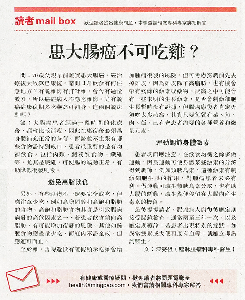 問﹕70歲父親早前證實患大腸癌,經治療後大致算已康復。請問日常飲食有何注意地方?有說雞肉有打針雞,會含有過量激素,所以癌症病人不應吃雞肉。另有說癌症康復期多吃燕窩可補身。這兩個說法對嗎?