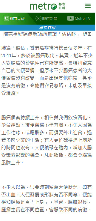 肺癌「霸佔」香港癌症排行榜首位多年,在2011年,終於被腸癌取代。其實,近年不少人對腸癌的警覺性已有所提高,會特別留意自己的大便習慣,但原來不少腸癌患者的大便習慣沒有改變,而是出現其他病徵,甚至是沒有病徵,令他們容易忽略,未能及早接受治療。