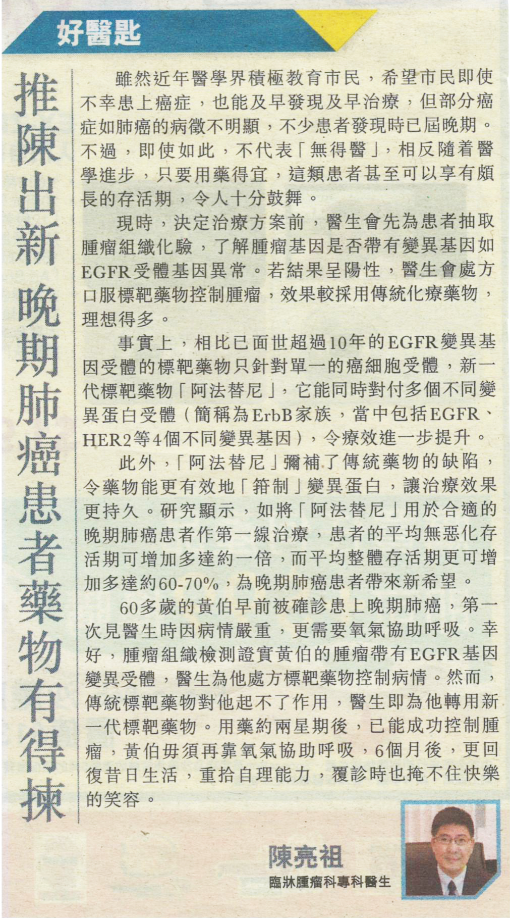 此外,「阿法替尼」彌補了傳統藥物的缺陷,令藥物能更有效地「箝制」變異蛋白,讓治療效果更持久。研究顯示,如將「阿法替尼」用於合適的晚期肺癌患者作第一線治療,患者的平均無惡化存活期可增加多達約一倍,而平均整體存活期更可增加多達約60-70% ,為晚期肺癌患者帶來新希望。