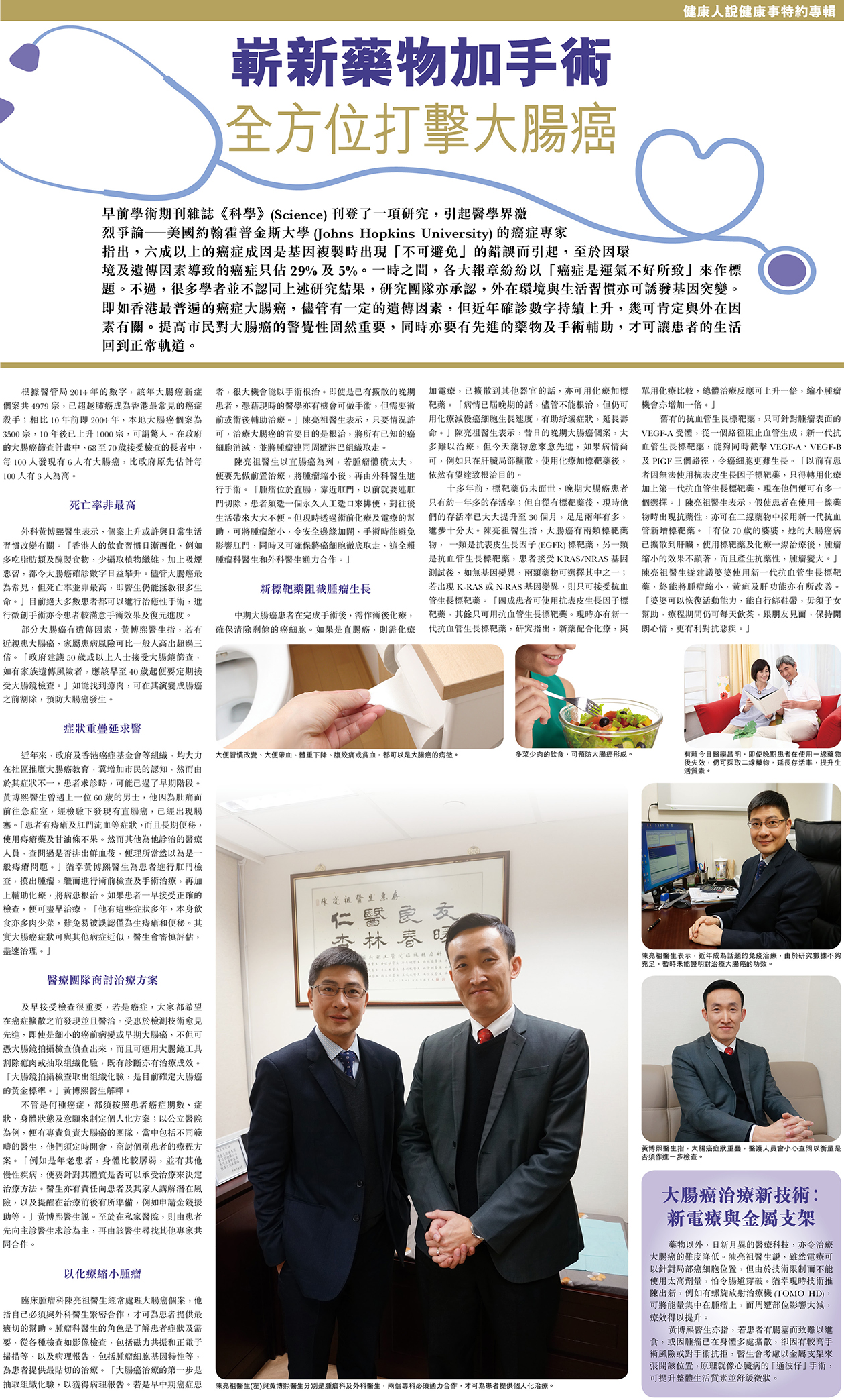 早前學術期刊雜誌《科學》(Science)刊登了一項研究,引起醫學界激烈爭論——美國約翰霍普金斯大學(Johns Hopkins University)的癌症專家指出,六成以上的癌症成因是基因複製時出現「不可避免」的錯誤而引起,至於因環境及遺傳因素導致的癌症只佔29%及5%。一時之間,各大報章紛紛以「癌症是運氣不好所致」來作標題。不過,很多學者並不認同上述研究結果,研究團隊亦承認,外在環境與生活習慣亦可誘發基因突變。即如香港最普遍的癌症大腸癌,儘管有一定的遺傳因素,但近年確診數字持續上升,幾可肯定與外在因素有關。提高市民對大腸癌的警覺性固然重要,同時亦要有先進的藥物及手術輔助,才可讓患者的生活回到正常軌道。