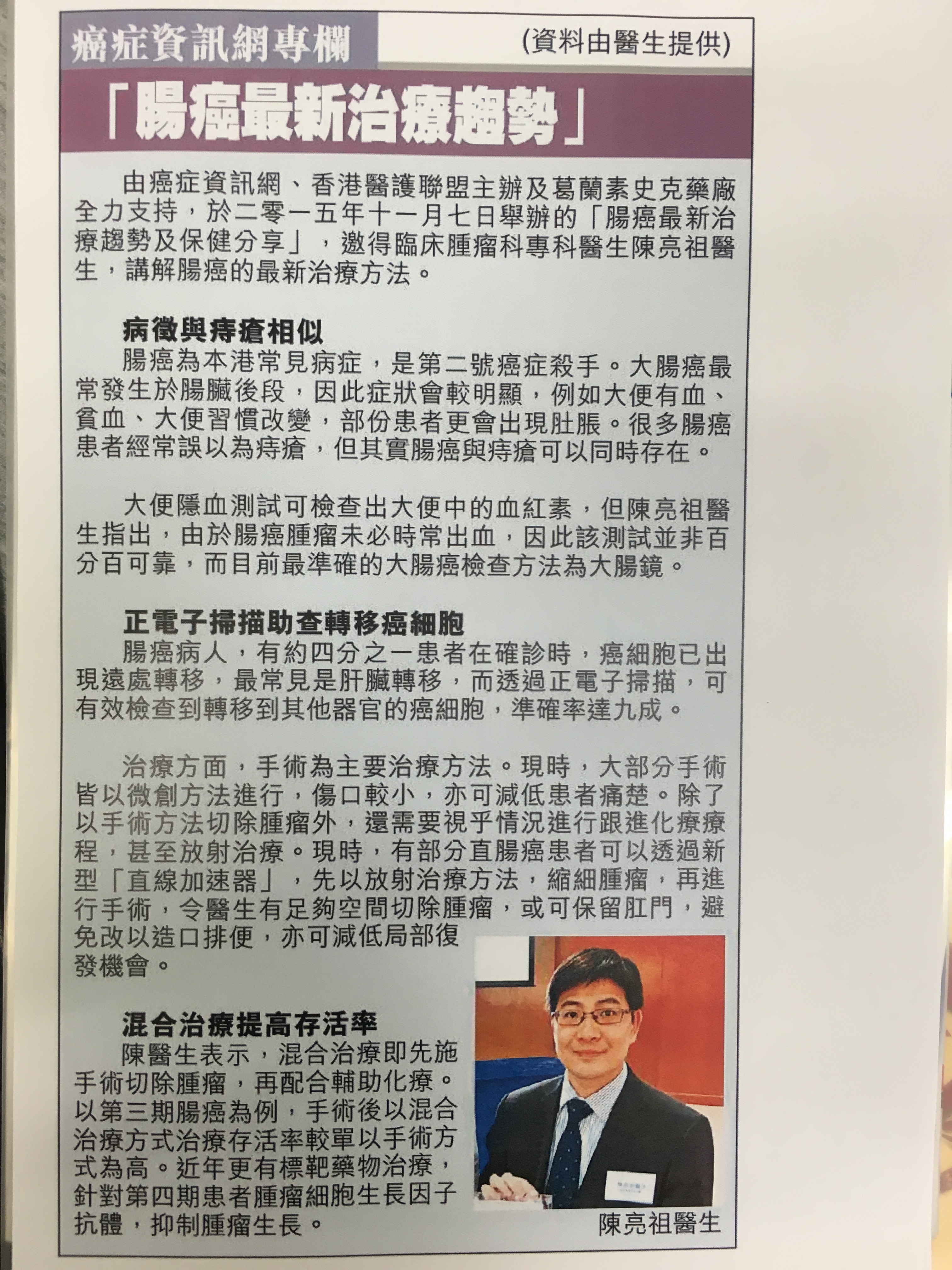 由癌症資訊網、香港醫護聯盟主辦及葛蘭素史克藥廠全力支持,於二零一五年十一月七日舉辦的「腸癌最新治療趨勢及保健分享」,邀得臨床腫瘤科專科醫生陳亮祖醫生,講解腸癌的最新治療方法。