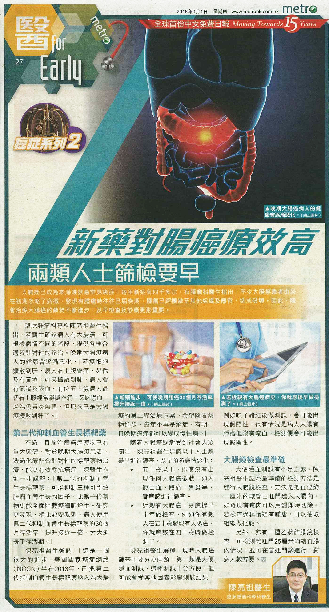 大腸癌已成為本港頭號最常見癌症,每年新症有四千多宗,有腫瘤科醫生指出,不少大腸癌患者由於在初期忽略了病徵,發現有腫瘤時往往已屆晚期,腫瘤已經擴散至其他組織及器官,造成破壞。因此,隨着治療大腸癌的藥物不斷進步,及早檢查及診斷更為重要。