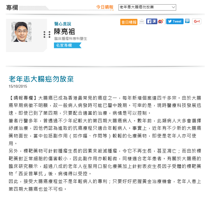 筆者行醫多年,曾遇過不少年紀較大的第四期大腸癌病人。數年前,此類病人大多會選擇紓緩治療,因他們認為進取的抗癌療程只適合年輕病人。事實上,近年有不少新的大腸癌藥物面世,當中包括副作用(如作嘔、作悶等)較輕的化療藥物,即使是老年人亦可使用。