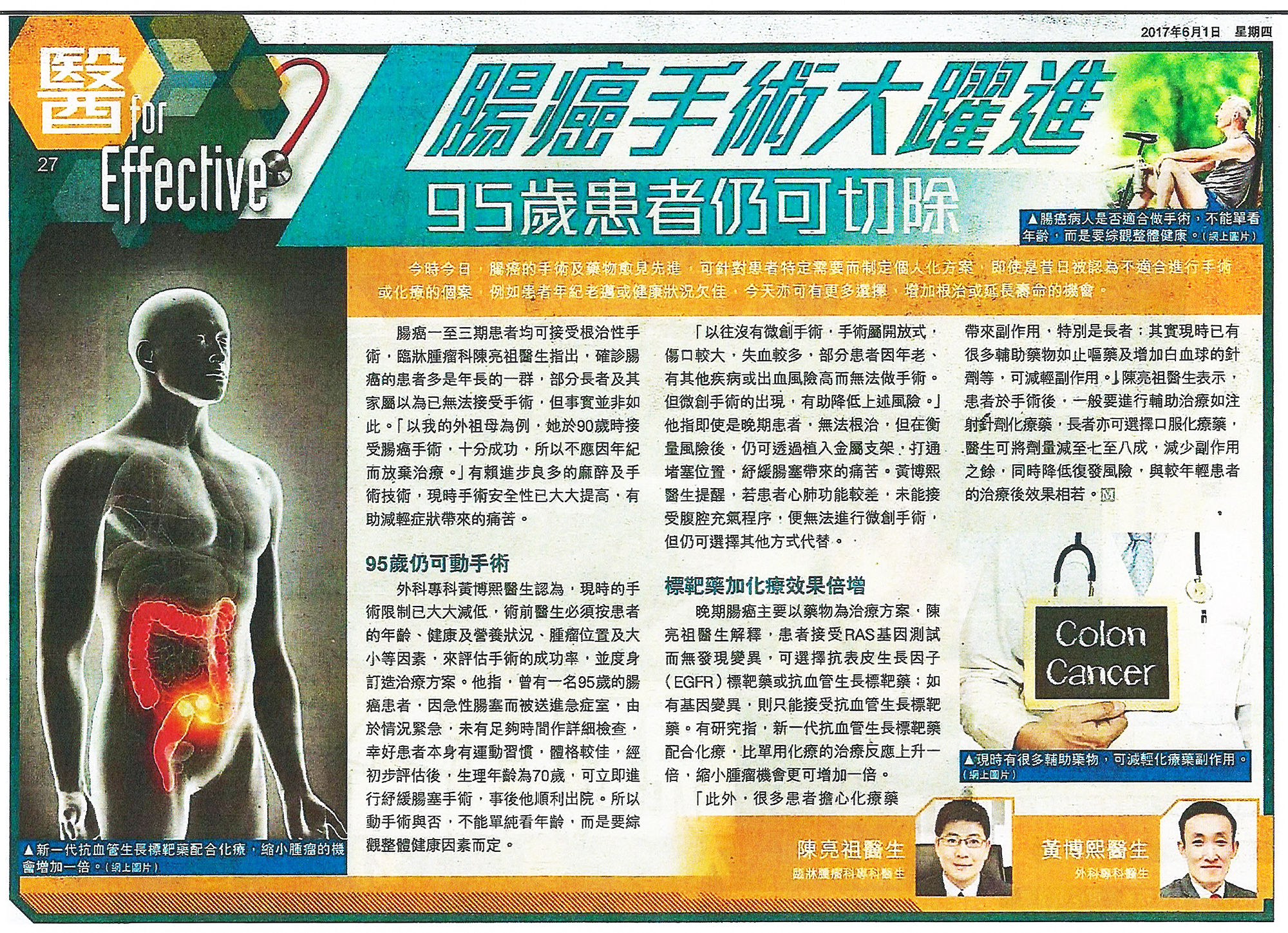 腸癌一至三期患者均可接受根治性手術,臨牀腫瘤科陳亮祖醫生指出,確診腸癌的患者多是年長的一群,部分長者及其家屬以為已無法接受手術,但事實並非如此。「以我的外祖母為例,她於90歲時接受腸癌手術,十分成功,所以不應因年紀而放棄治療。」有賴進步良多的麻醉及手術技術,現時手術安全性已大大提高,有助減輕症狀帶來的痛苦。