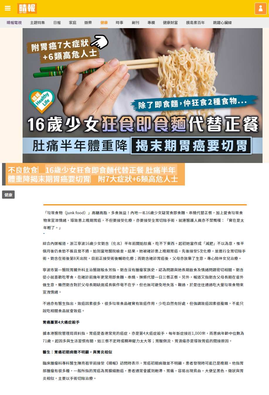 「垃圾食物(junk food)」高糖高脂,多食無益!內地一名16歲少女疑常食即食麵、串燒代替正餐,加上愛食垃圾食物來宣泄情緒,導致患上晚期胃癌,不但要接受化療,亦要接受全胃切除手術,就連醫護人員亦不禁慨嘆:「實在是太年輕了。」