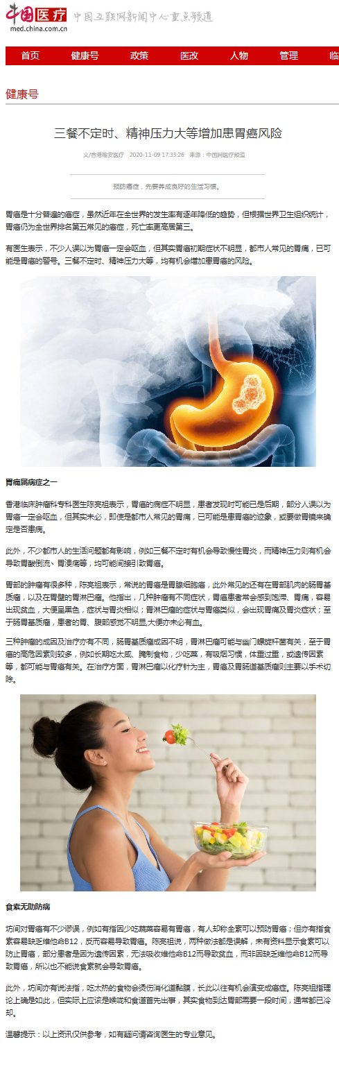 有醫生表示,不少人誤以為胃癌一定會嘔血,但其實胃癌初期症狀不明顯,都市人常見的胃痛,已可能是胃癌的警號。三餐不定時、精神壓力大等,均有機會增加患胃癌的風險。