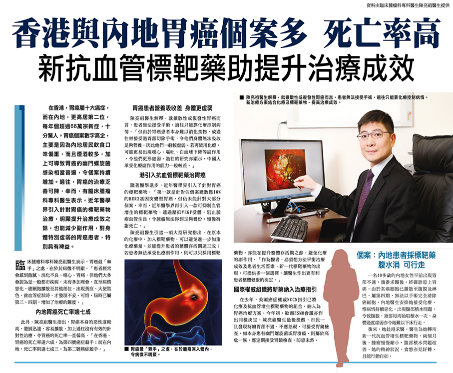 在去年,美國癌症權威NCCN指引已將化療及抗血管增生標靶藥物的組合,納入為胃癌治療方案,今年初,歐洲ESMO會議亦作出同樣決定。陳亮祖醫生最後提醒,市民一旦發現持續胃部不適,不應忽視,可接受胃鏡檢查。如本身患有幽門螺旋菌或胃潰瘍,則屬於高危一族,應定期接受胃鏡檢查,防患未然。