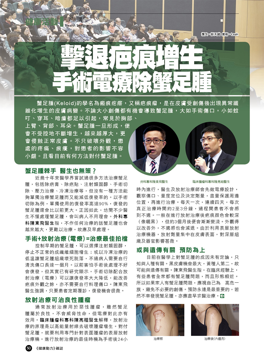 控制早期的蟹足腫,可以選擇注射類固醇,停止不正常的成纖維細胞增生;或以冷凍治療的低溫讓蟹足腫組織壞死脫落,不過病人需要自行清洗傷口長達一個月。以前害怕手術後處理不好會復發,但其實已有研究顯示,手術切除配合放射治療(電療)可以讓復發率大大降低,能改善疤痕外觀之餘,亦不需要自行料理傷口。陳東飛醫生強調,只要患者定期覆診,復發機會很微。
