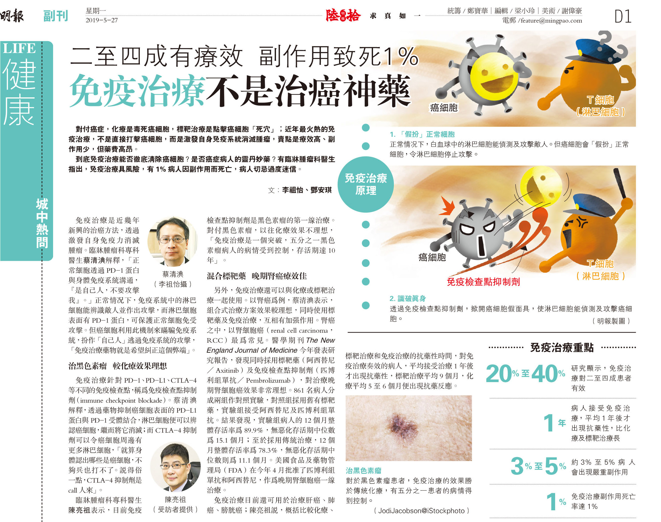 臨牀腫瘤科專科醫生陳亮祖表示,目前免疫檢查點抑制劑是黑色素瘤的第一線治療。對付黑色素瘤,以往化療效果不理想,「標靶藥物治療是一個突破,五分之一黑色素瘤病人的病情受到控制,存活期達10年」。