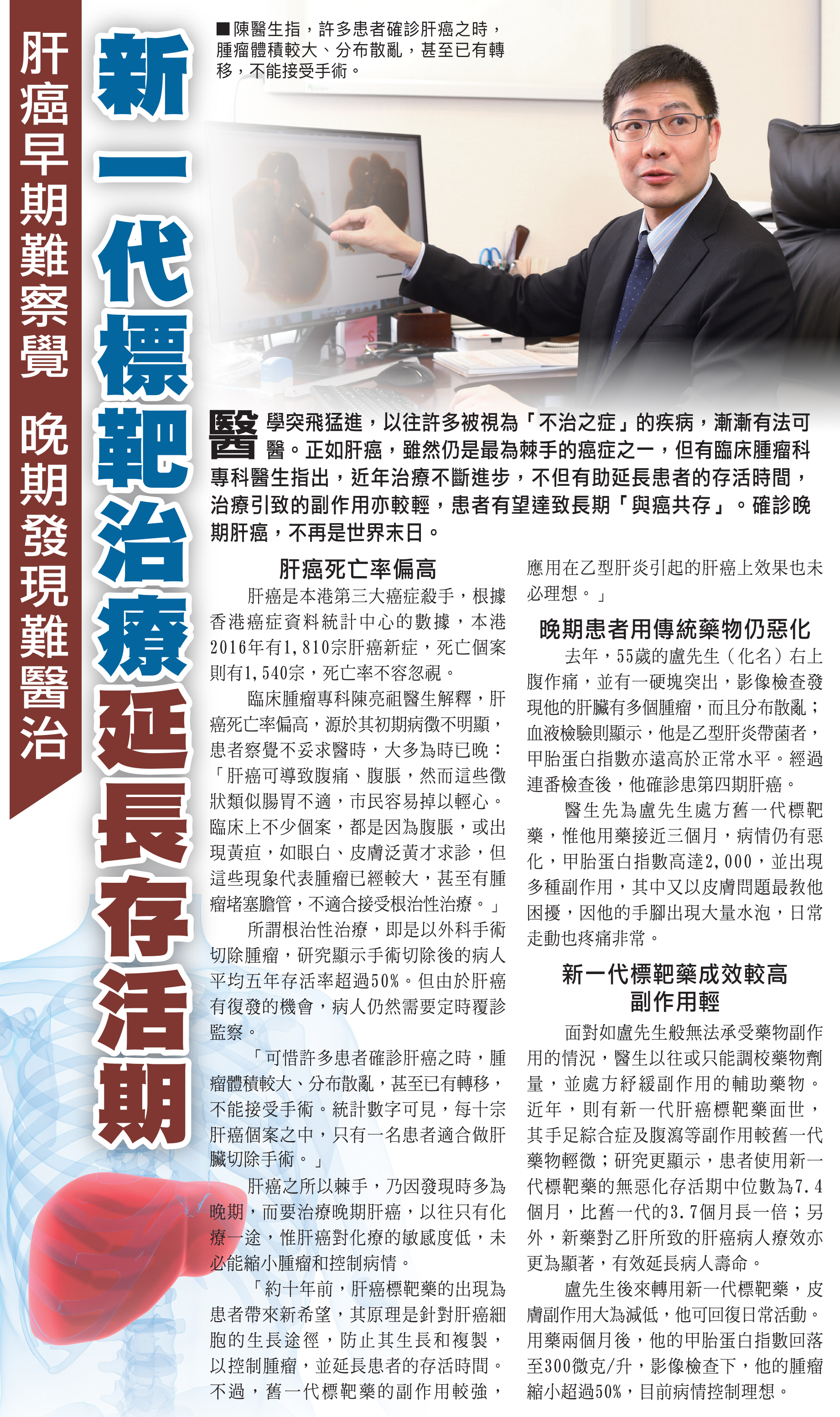 醫學突飛猛進,以往許多被視為「不治之症」的疾病,漸漸有法可醫。正如肝癌,雖然仍是最為棘手的癌症之一,但有臨床腫瘤科專科醫生指出,近年治療不斷進步,不但有助延長患者的存活時間,治療引致的副作用亦較輕,患者有望達致長期「與癌共存」。確診晚期肝癌,不再是世界末日。