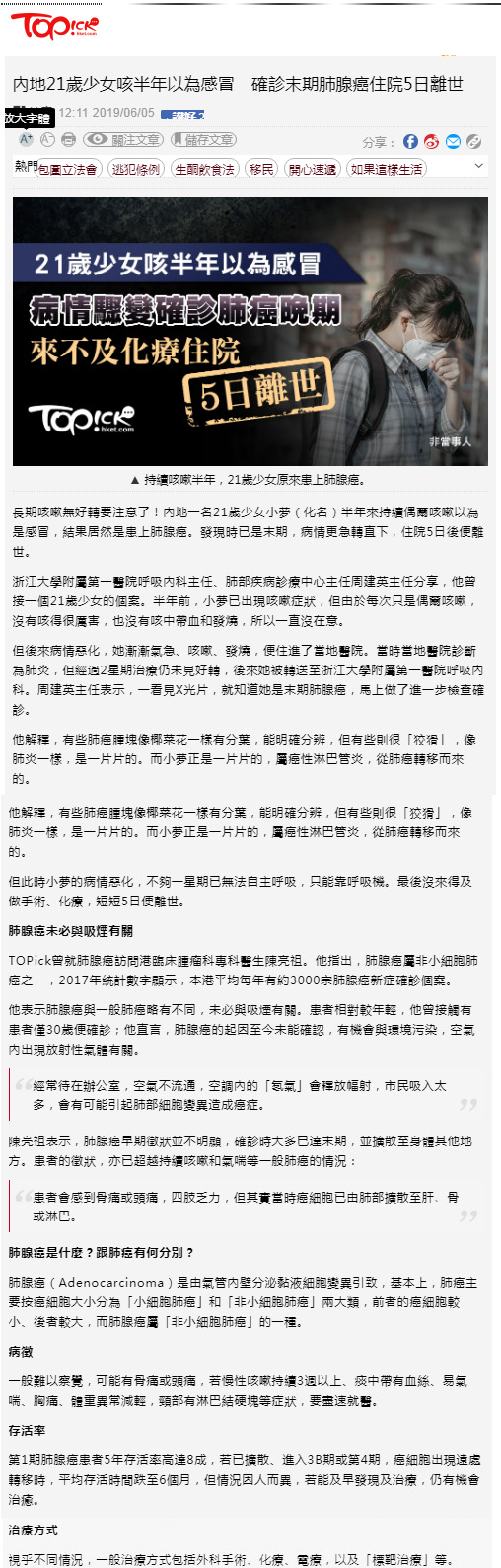 長期咳嗽無好轉要注意了!內地一名21歲少女小夢(化名)半年來持續偶爾咳嗽以為是感冒,結果居然是患上肺腺癌。發現時已是末期,病情更急轉直下,住院5日後便離世。