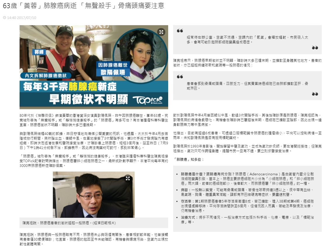 80年代於《神雕俠侶》飾演黃蓉的香港資深女演員歐陽佩珊,昨午因肺腺癌離世,享年63歲。究竟被形容為「無聲殺手」或「靜悄悄健康殺手」的「肺腺癌」有多可怕?有本港腫瘤科專科醫生直言,肺腺癌徵狀不明顯,確診時大多已達晚期。