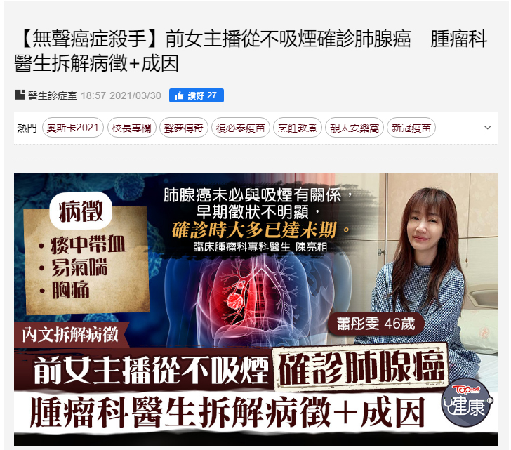 肺腺癌早期徵狀並不明顯,故被形容為「無聲殺手」。台灣前女主播蕭彤雯近日在社交媒體發文,指自己患上肺腺癌0期,即俗稱原位癌,目前已經接受手術。不過,她自問從不吸煙,亦沒有家族遺傳等因素,沒料到會患上此病。有本港腫瘤科專科醫生指出,肺腺癌未必與吸煙有關係,患者相對較年輕,有個案僅30歲便確診。