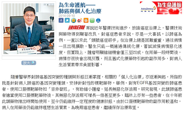 常說近年醫療技術進步,放諸癌症治療上,醫療技術與藥物得到顯著改良,對癌症患者來說,亦是一大喜訊。以肺癌為例,一直以來此「頭號癌症殺手」在治療上總是困難重重,過往病情一旦出現擴散,醫生只能一概通過傳統化療,嘗試減慢病情惡化速度,但實際上,腫瘤明顯縮細機會僅三至四成,在用藥一段時間後,病情亦很快會出現反覆,而且舊式化療藥物引起的副作用多,對病人生活質素帶來負面影響。