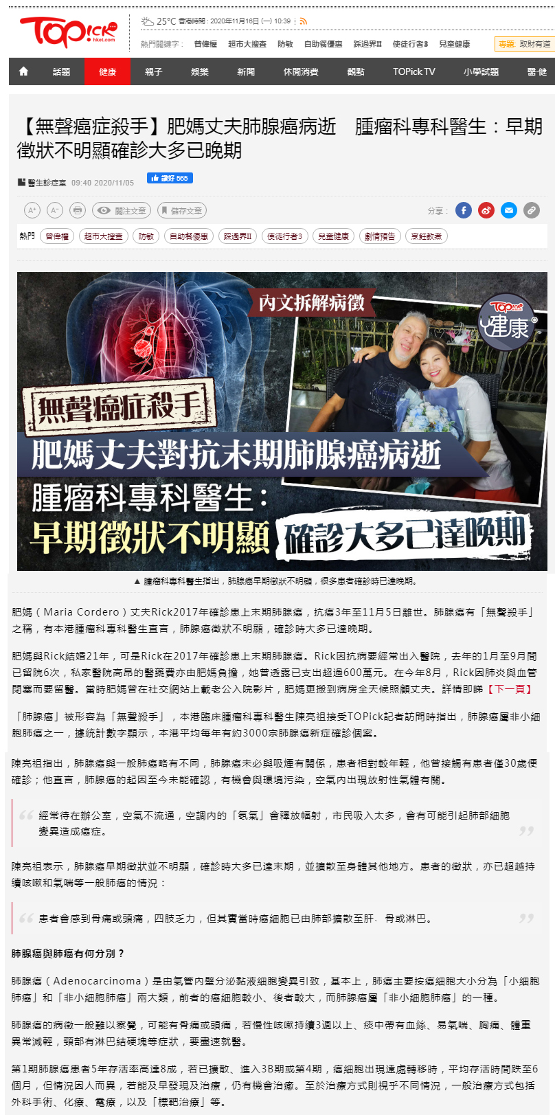 肥媽(Maria Cordero)丈夫Rick2017年確診患上末期肺腺癌,抗癌3年至11月5日離世。肺腺癌有「無聲殺手」之稱,有本港腫瘤科專科醫生直言,肺腺癌徵狀不明顯,確診時大多已達晚期。