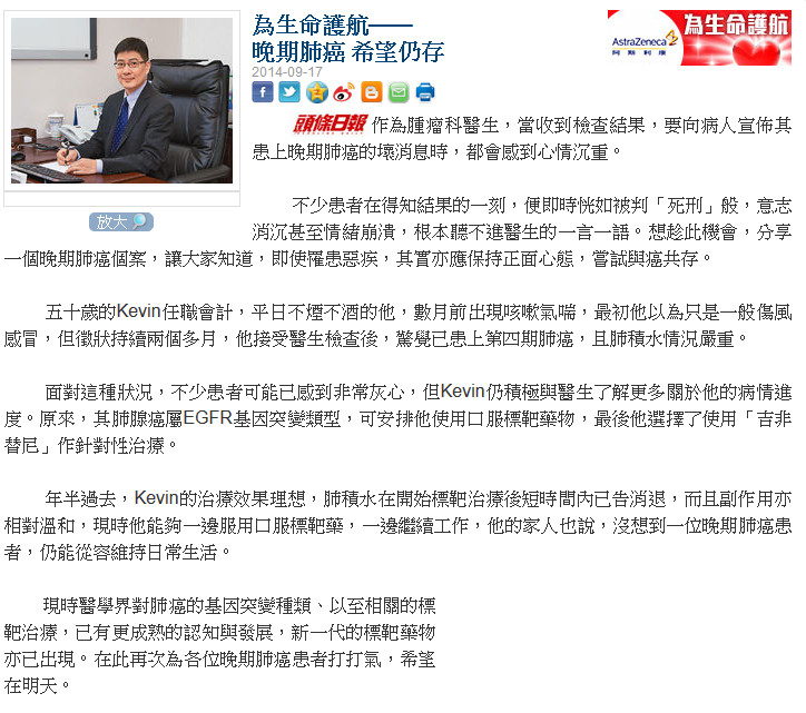 現時醫學界對肺癌的基因突變種類、以至相關的標靶治療,已有更成熟的認知與發展,新一代的標靶藥物亦已出現。在此再次為各位晚期肺癌患者打打氣,希望在明天。