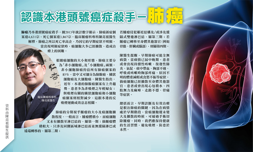 肺癌乃本港頭號癌症殺手。據2013年統計數字顯示,肺癌新症個案達4,631宗,死亡個案達3,867宗。臨床腫瘤科專科陳亮祖醫生解釋,肺癌之所以死亡率高企,乃因它的早期症狀不明顯,當出現明顯症狀時,癌細胞大多已經擴散,造成治療上的困難。