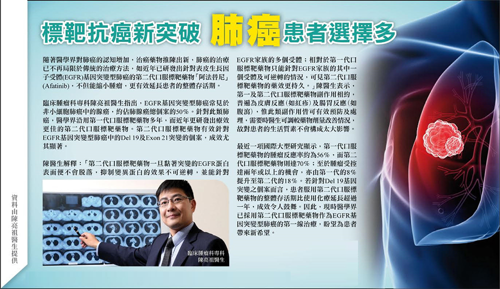 臨床腫瘤科專科陳亮祖醫生指出,EGFR基因突變型肺癌常見於非小細胞肺癌中的腺癌,約佔肺腺癌總個案的50%。針對此類肺癌,醫學界沿用第一代口服標靶藥物多年,而近年更研發出療效更佳的第二代口服標靶藥物。第二代口服標靶藥物有效針對EGFR基因突變型肺癌中的Del 19及Exon 21突變的個案,成效尤其顯著。