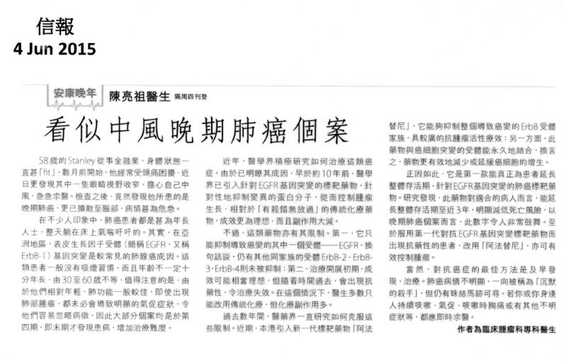 58歲的Stanley從事金融業,身體狀態一直甚「fit」,數月前開始,他經常受頭痛困擾,近日更發現其中一隻眼睛視野收窄,擔心自己中風,急急求醫。檢查之後,竟然發現他所患的是晚期肺癌,更已擴散至腦部,病情甚為危急。