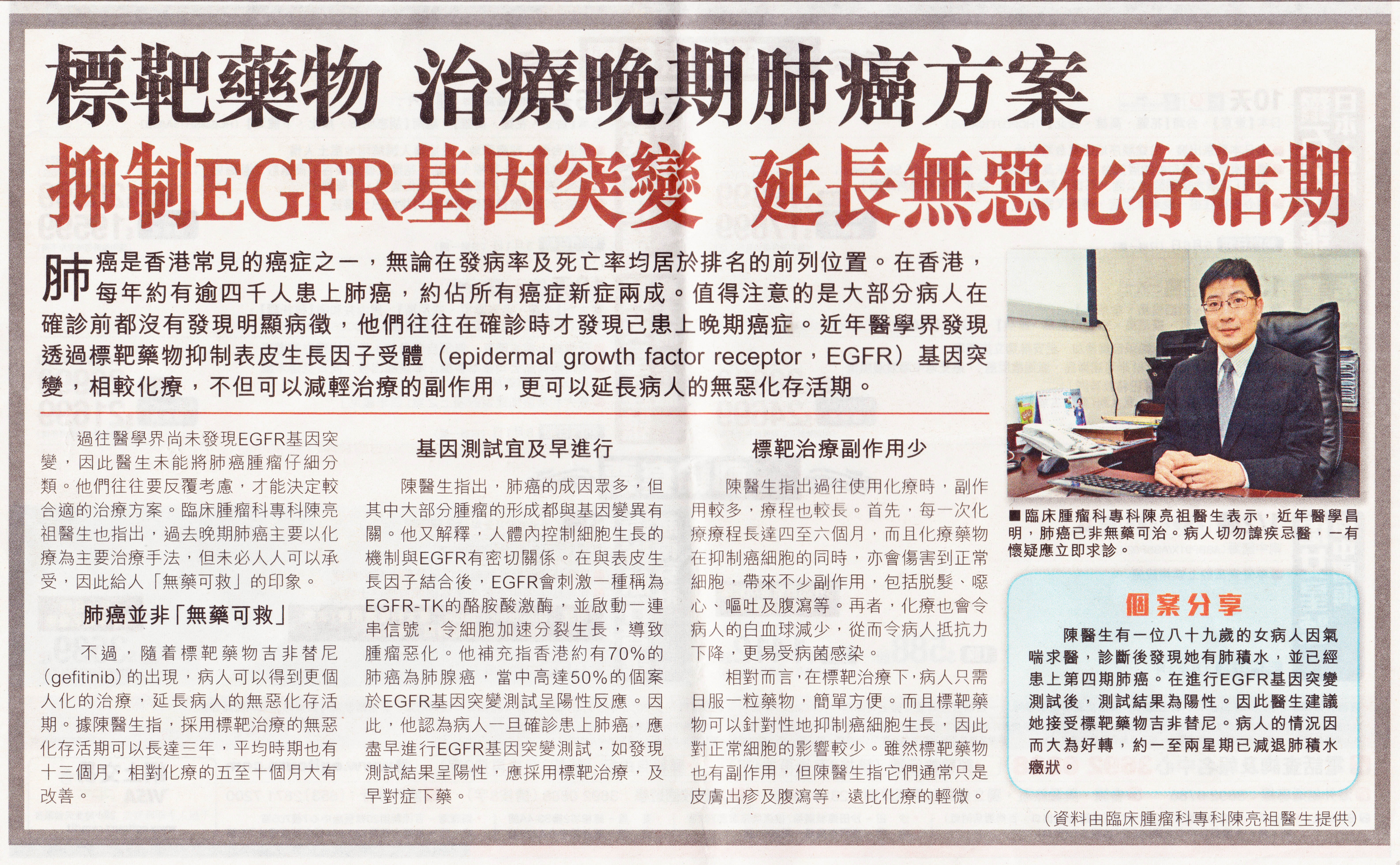 陳醫生有一位八十九歲的女病人因氣喘求醫,診斷後發現她有肺積水,並已經患上第四期肺癌。在進行EGFR基因突變測試後,測試結果為陽性。因此醫生建議她接受標靶藥物吉非替尼。病人的情況因而大為好轉,約一至兩星期已減退肺積水癥狀。