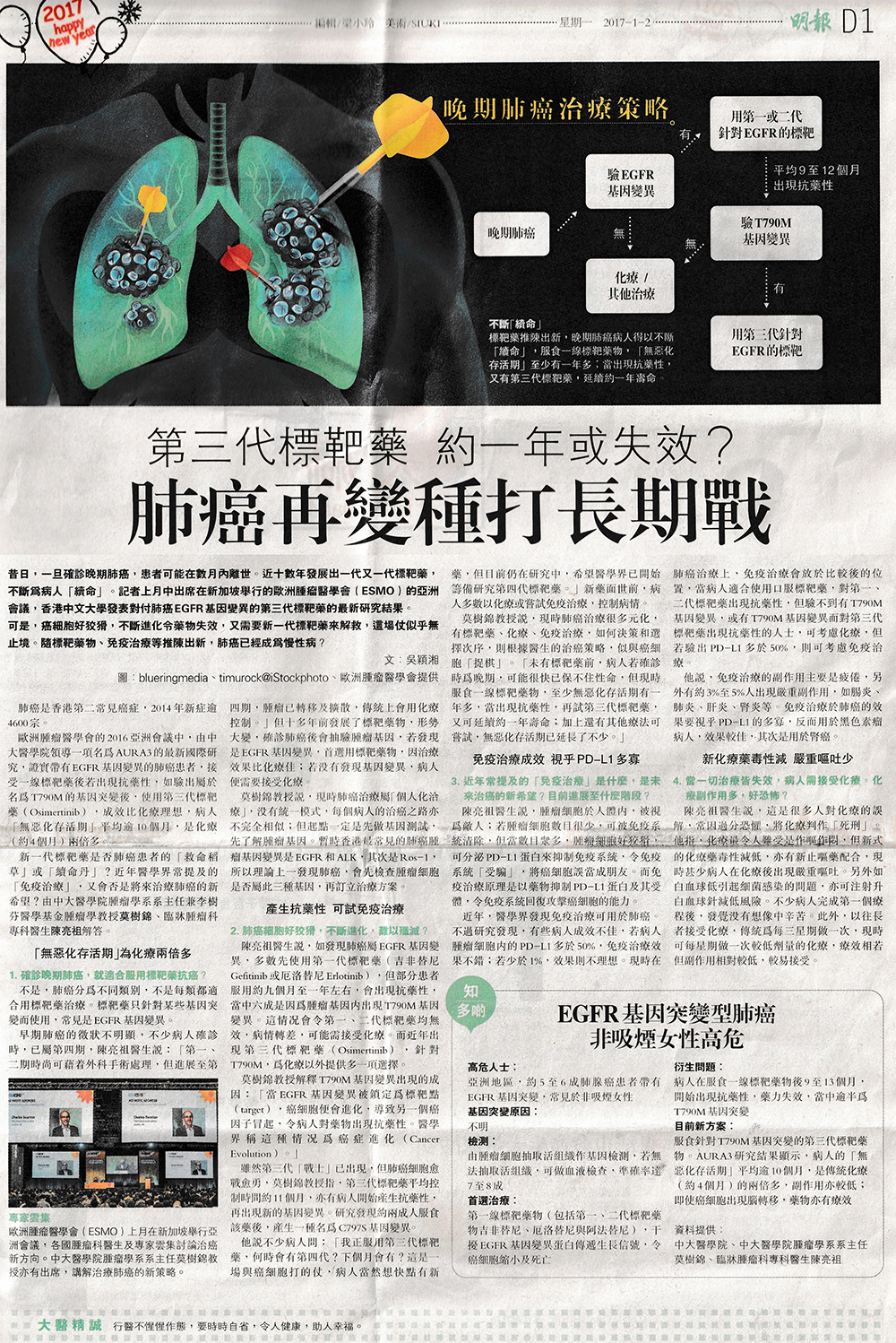 歐洲腫瘤醫學會的2016亞洲會議中,由中大醫學院領導一項名為AURA3的最新國際研究,證實帶有EGFR基因變異的肺癌患者,接受一線標靶藥後若出現抗藥性,如驗出屬於名為T790M的基因突變後,使用第三代標靶藥(Osimertinib),成效比化療理想,病人「無惡化存活期」平均逾10個月,是化療(約4個月)兩倍多。 新一代標靶藥是否肺癌患者的「救命稻草」或「續命丹」?近年醫學界常提及的「標靶藥物治療」,又會否是將來治療肺癌的新希望?由中大醫學院腫瘤學系系主任兼李樹芬醫學基金腫瘤學教授莫樹錦、臨牀腫瘤科專科醫生陳亮祖解答。