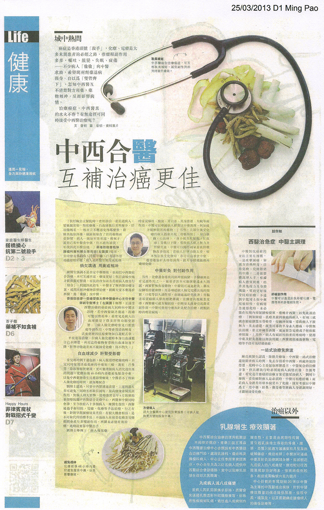 劉博士認為,只要中西醫溝通清楚,上述問題大多可避免,同時互相取長補短,提高療效並減低副作用,對病人利大於弊。防癌會於去年9月開辦的麥紹堅伉儷中西醫結合化療中心,西醫和中醫同時會診,至今收症八十多個病人。陳醫生指出,西醫通過手術切除、電療、化療等手法治癌,行之有效,針對早期腫瘤效果尤佳,有較大機會根治,是不可取代的治療手法;不過病人在接受化療及電療期間會產生多種副作用,西醫未必能有效治療,此時就要靠中醫出手。
