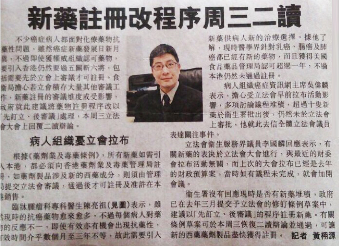 病人組織癌症資訊網主席吳偉麟表示,擔心受立法會早前拉布活動影響,多項討論議程堆積,超過十隻新藥於衛生署批出後,仍然未於立法會上審批,他就此去信全體立法會議員表達關注事件。