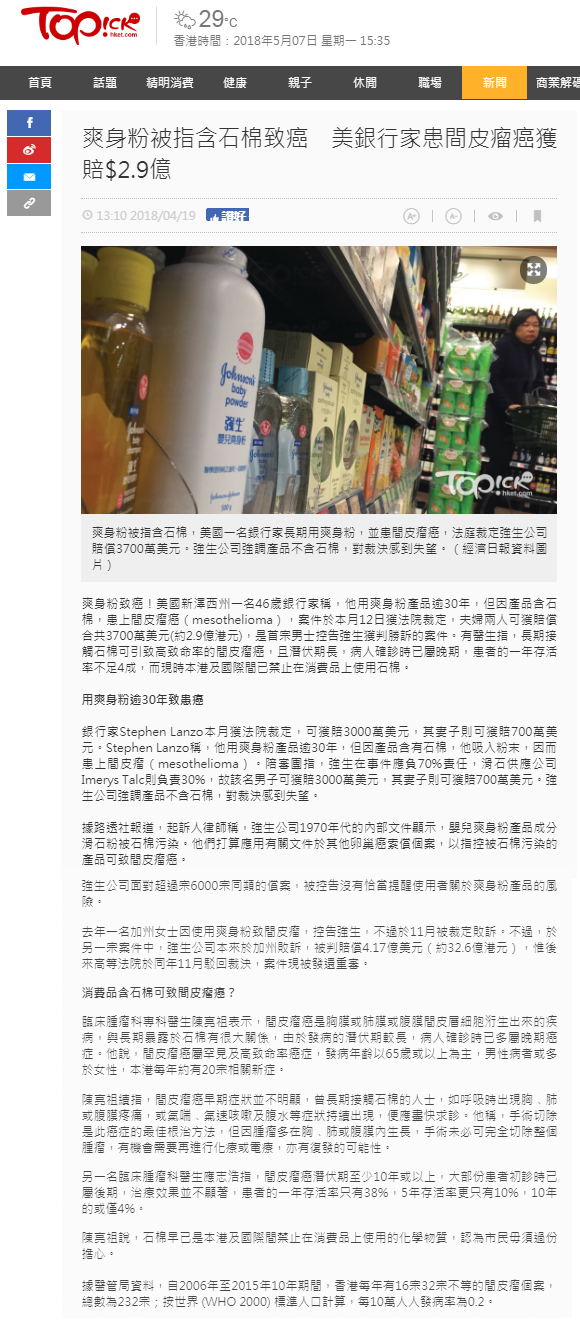 銀行家Stephen Lanzo本月獲法院裁定,可獲賠3000萬美元,其妻子則可獲賠700萬美元。Stephen Lanzo稱,他用爽身粉產品逾30年,但因產品含有石棉,他吸入粉末,因而患上間皮瘤(mesothelioma)。陪審團指,強生在事件應負70%責任,滑石供應公司Imerys Talc則負責30%,故該名男子可獲賠3000萬美元,其妻子則可獲賠700萬美元。強生公司強調產品不含石棉,對裁決感到失望。