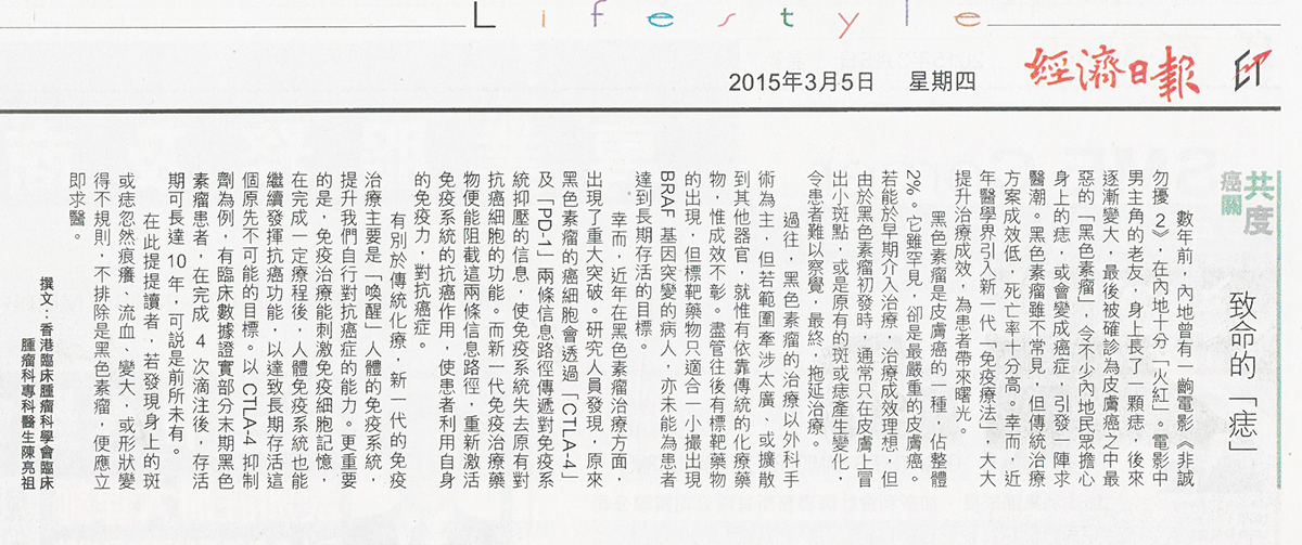 數年前,內地曾有一齣電影《非誠勿擾 2》,在內地十分「火紅」。電影中男主角的老友,身上長了一顆痣,後來逐漸變大,最後被確診為皮膚癌之中最惡的「黑色素瘤」,令不少內地民眾擔心身上的痣,或會變成癌症,引發一陣求醫潮。黑色素瘤雖不常見,但傳統治療方案成效低,死亡率十分高。幸而,近年醫學界引入新一代「免疫療法」,大大提升治療成效,為患者帶來曙光。